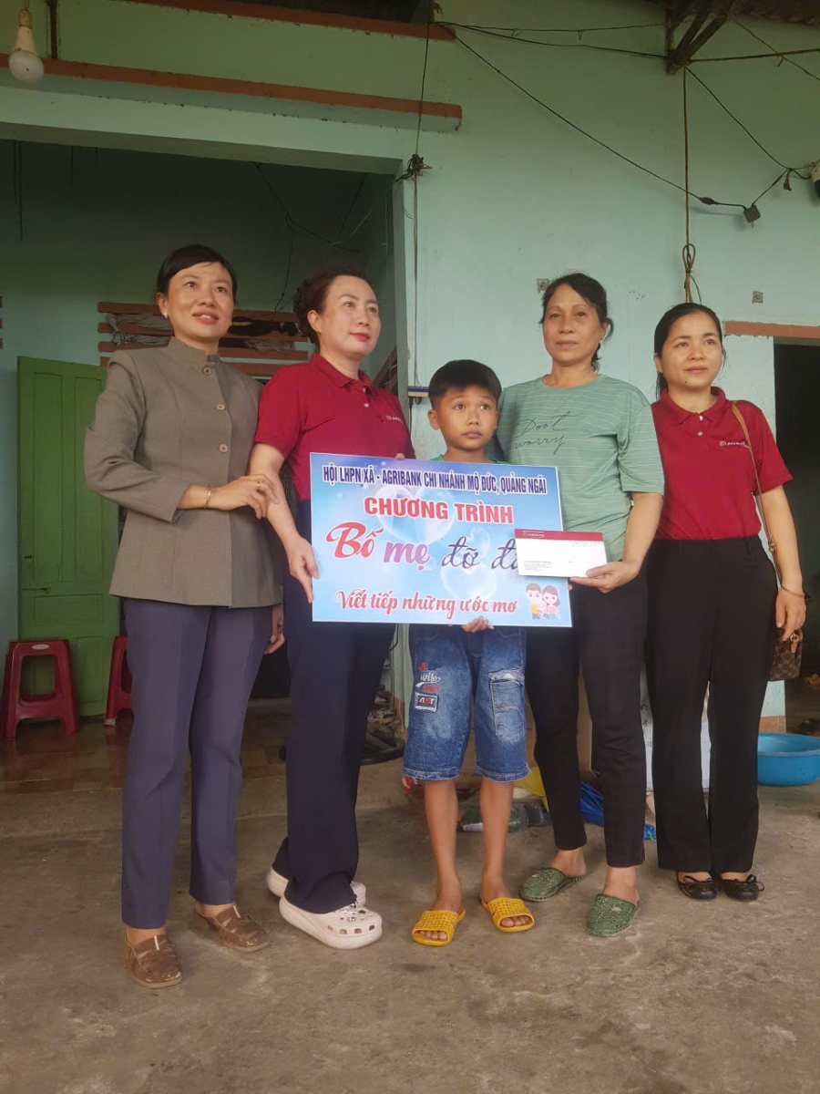Đồng chí Đặng Thị Kim Phượng - PCT Hội LHPN xã cùng các anh chị đại diện Ngân hàng Agribank CN Mộ Đức trao quà cho em Lê Quang Thiện