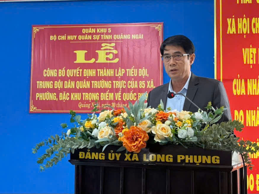 Chiều ngày 30/12/2025, tại Hội trường Đảng ủy xã, UBND xã Long Phụng long trọng tổ chức Lễ công bố quyết định thành lập, Tiểu đội, Trung đội Dân quân thường trực (DQTT). Dự buổi lễ có Trung tá Hồ Anh Triết – Chủ nhiệm Chính trị Ban Chỉ huy Phòng thủ khu vực 5 – Đức Phổ. Về phía lãnh đạo địa phương có đồng chí Trần Công Hòa – Bí thư Đảng ủy xã; đồng chí Ngô Văn Thanh – Phó Bí thư Đảng ủy, Chủ tịch UBND xã; đồng chí Huỳnh Văn Sơn - Ủy viên BTV, Phó Chủ tịch HĐND xã; cùng đại diện lãnh đạo các ban, ngành của xã và các đơn vị có liên quan.