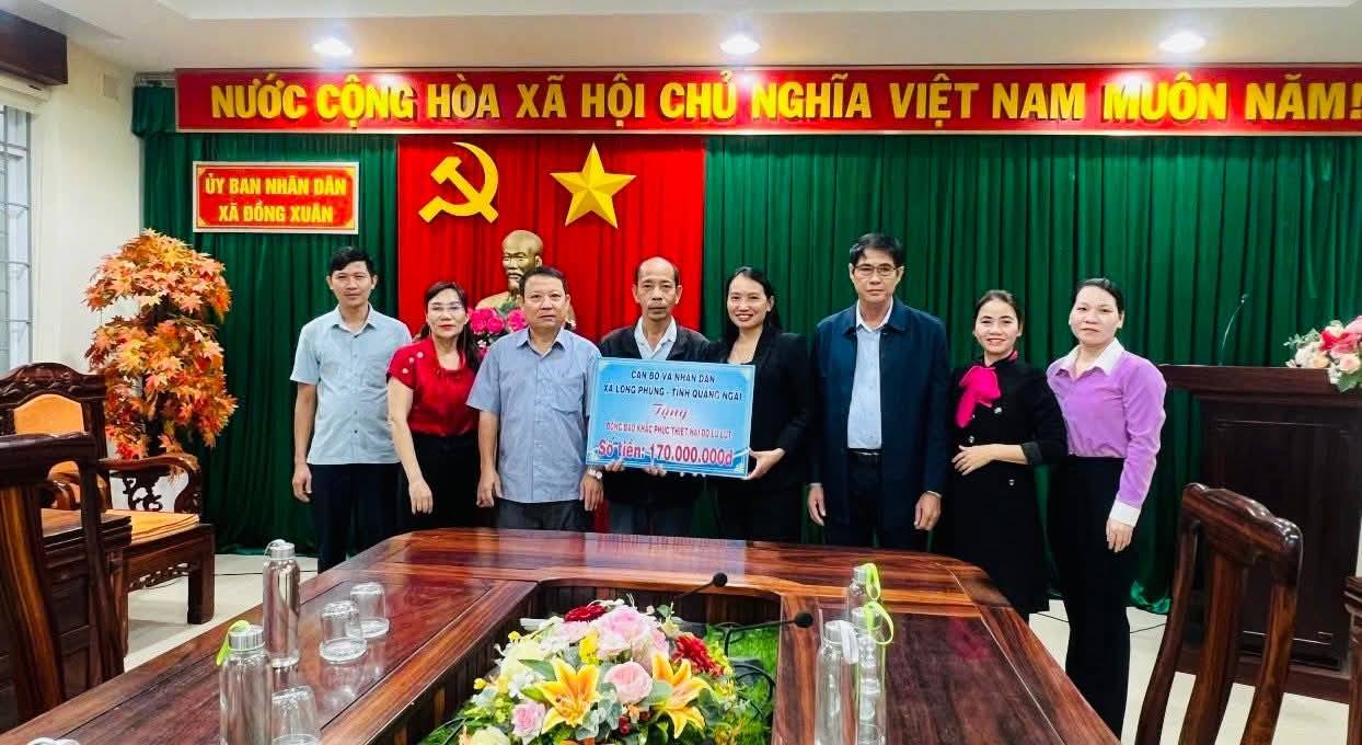 Tại buổi làm việc, đoàn công tác xã Long Phụng đã bày tỏ sự chia sẻ trước những thiệt hại mà địa phương xã Đồng Xuân phải gánh chịu, đồng thời trao tặng 170 triệu đồng hỗ trợ bà con khắc phục hậu quả thiên tai. Sau khi thống nhất, xã Đồng Xuân phân bổ toàn bộ kinh phí này cho 170 hộ dân thôn Long Hòa, mỗi hộ nhận 1 triệu đồng. Đoàn công tác xã Long Phụng đã trực tiếp trao số tiền hỗ trợ đến từng hộ dân.